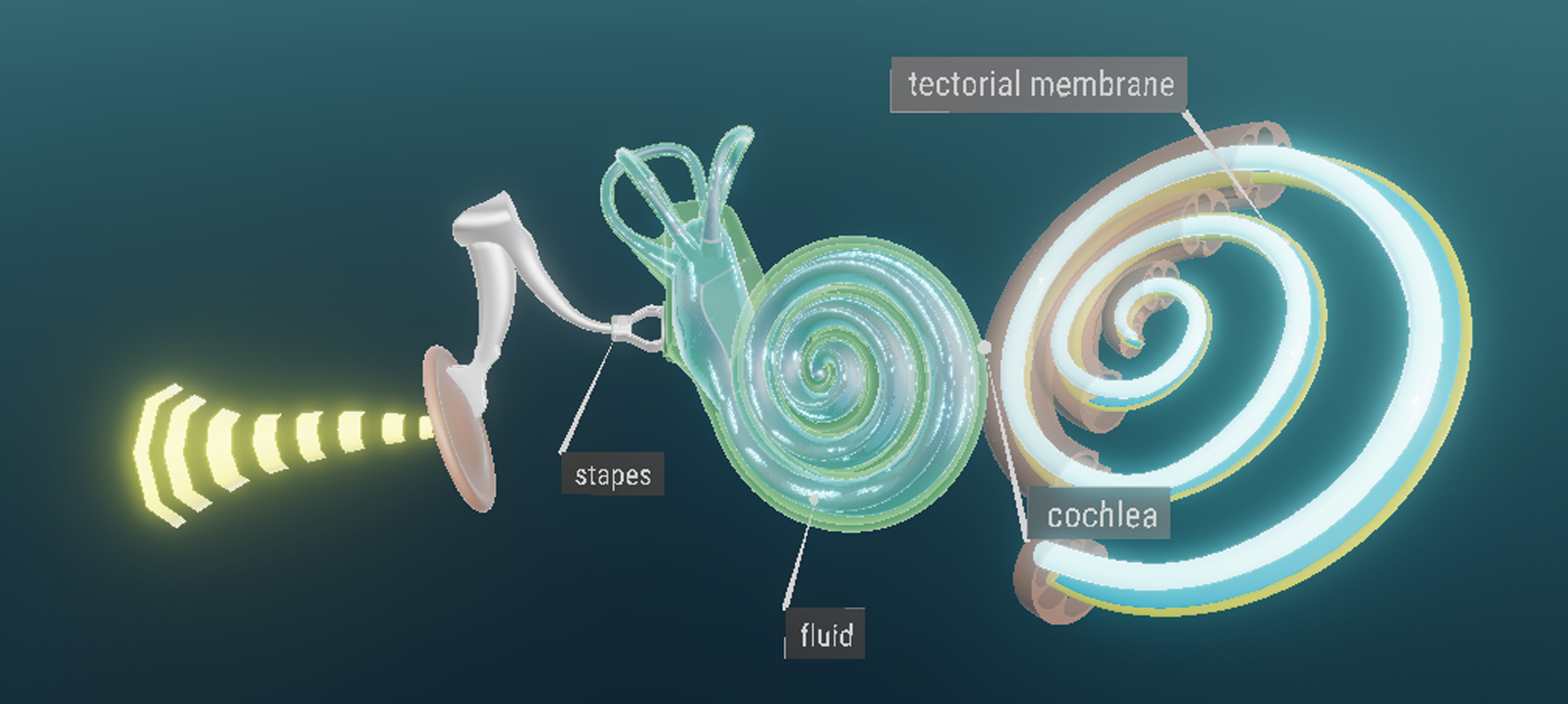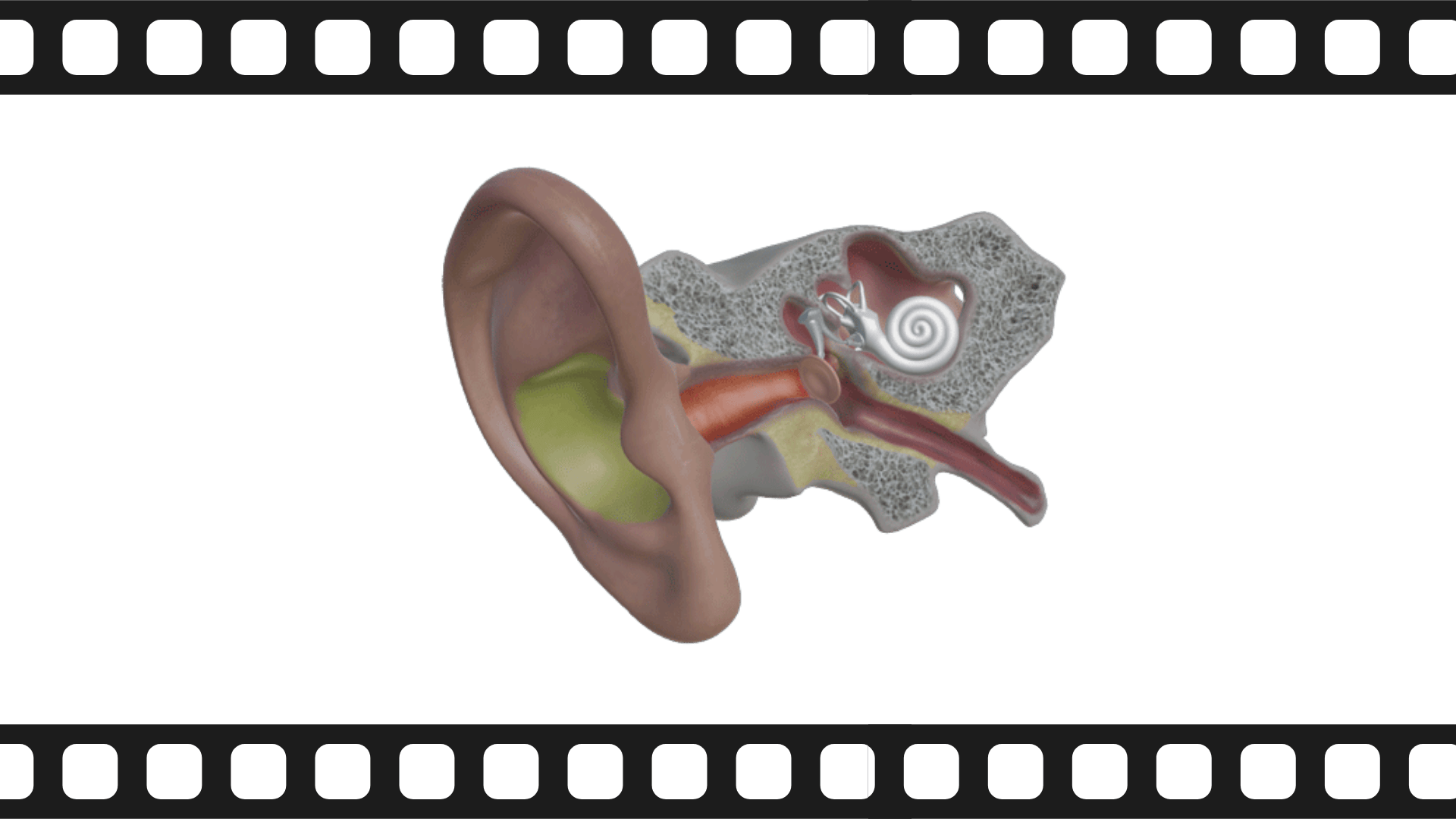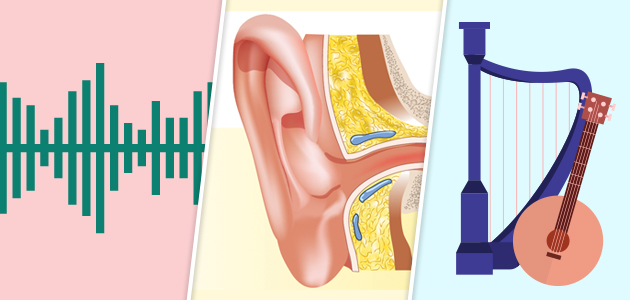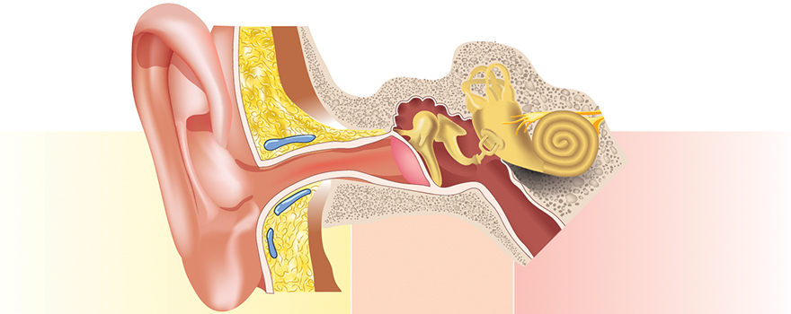 The outer ear consists of the cartilaginous auricle and the external auditory canal, which is separated from the middle ear by the eardrum. The auricle gathers sound waves for the middle ear. Essentially, the eardrums act like drumheads; they pass the vibrations from the air to the tiny auditory ossicles in the middle ears (malleus, incus, and stapes, or hammer, anvil and stirrup, respectively). These little bones are in an air-filled cavity, and their function is to transmit the vibrations from the eardrum to the inner ear. The middle ear is connected to the pharynx through a thin canal, called the Eustachian tube.