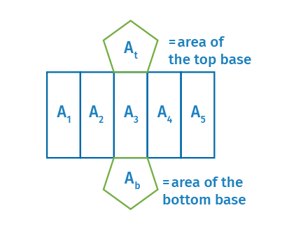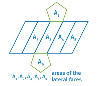 It is already known that the surface area (SA) of a prism (right or oblique) is the sum of the areas of its bounding faces. However, when calculating the volume (V), in the case of an oblique prism, the height (H) is determined by constructing a perpendicular line to the base. If the prism is right, the height is equal to the length of the generator. The lateral area (LA) is equal to the sum of the areas of the lateral faces.