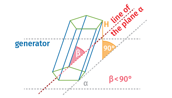 If the parallel generators of a prism are not perpendicular to the plane of the base, then it is an oblique prism. In this case, the angle between the generators and the base is an acute angle, which is less than 90°. Its lateral faces are parallelograms. The prism is right if the generators are perpendicular to the plane of the base. The development of the lateral surface of a right prism is always a rectangle whose width is equal to the perimeter of the base, and its height is equal to the length of the generator.